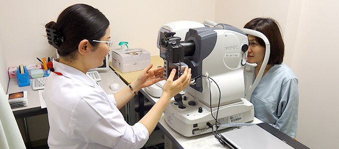 現在当科では、当院の他診療科もしくは他医療機関からの紹介患者様を中心に診療を行なっています。例えば糖尿病合併症や血液疾患の眼底異常、インターフェロンや結核療法中の定期検査、腎性網膜症などの管理といった他の疾患の影響から受診される方、白内障や緑内障といった目そのものの疾患で外来受診される方、外傷等の救急疾患で受診される方などが主な患者様です。また月に1回、義眼技師の方に来ていただいて義眼外来も行なっています。