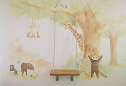 当院では入院された小児科の患者様が安心して療養しながら学習できるよう学習室、プレイルームを整備しております。沖縄県立森川特別支援学校と連携し、入院している児童・生徒の身体的症状に応じて適切な教育を行うことが目的の院内訪問学級です。この部屋には沖縄県立芸術大学の学生がデザインした壁画や、手作りの机、棚を配置するなど、とても優しい雰囲気で学習できる環境を整えています。