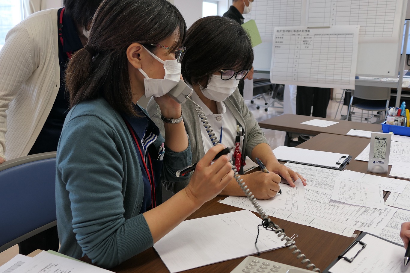 院内訓練では災害本部を設置し、病院機能維持や多数傷病者の受け入れ、入院患者さんへの対応などを訓練しました。