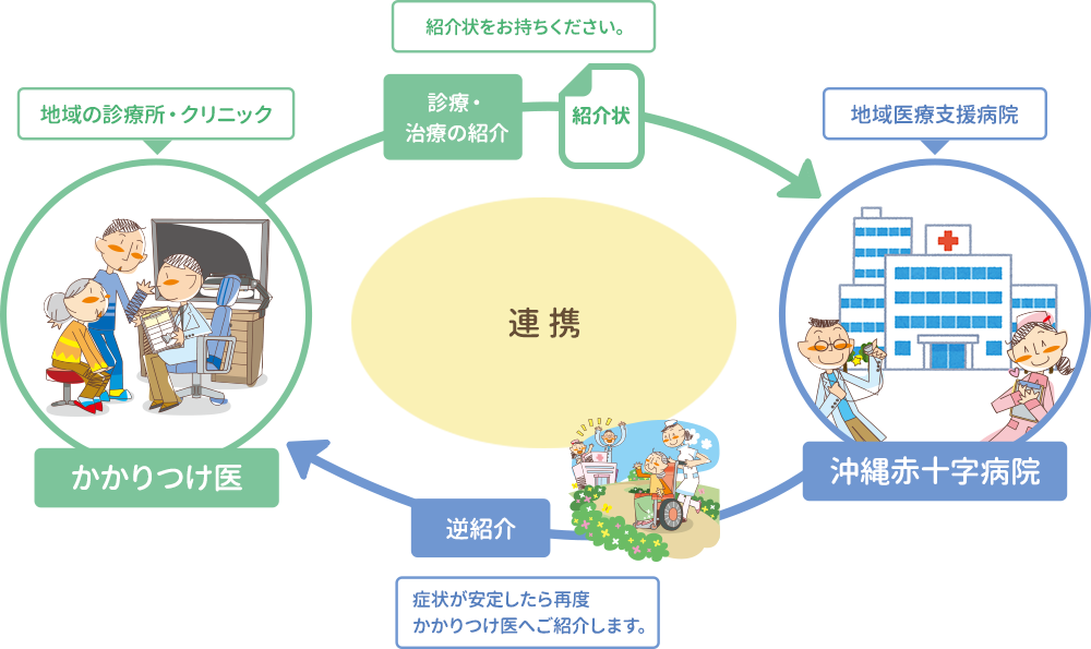 当院は急性期病院のため、地域の診療所やクリニックでは難しい精密検査や高度な治療、また緊急性の高い処置や治療が必要な患者様を優先的に診療しています。そのため、一般の診療をご希望の患者様をお待たせしてしまうことが多くあります。患者様自身のご負担を減らすためにも、気になる症状などがありましたら、まずは皆様のかかりつけ医にご相談してみてください。当院では初診時に「かかりつけ医」からの紹介状をお持ちになるよう強くお勧めしております。紹介状をお持ちでない患者様につきましては、選定療養費として7,700円(税込)を通常の医療費とは別にご負担いただきます。ご理解とご協力の程よろしくお願いいたします。